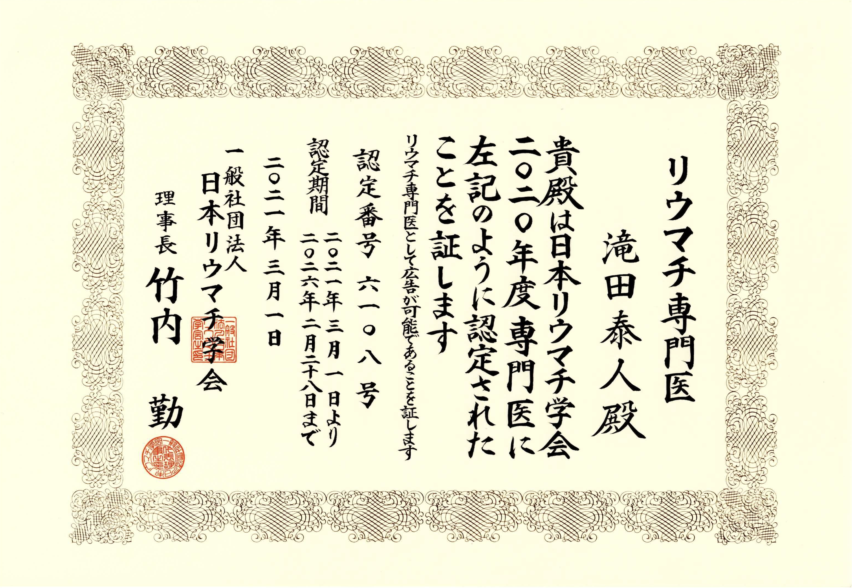また、私の専門分野の一つである関節リウマチについては2004年頃より本格的に取り組みはじめ、症例に応じ各種csDMARDsや生物学的製剤およびJAK阻害剤などを使用し、「日本リウマチ学会専門医」として短期間での寛解導入達成を目指しております。