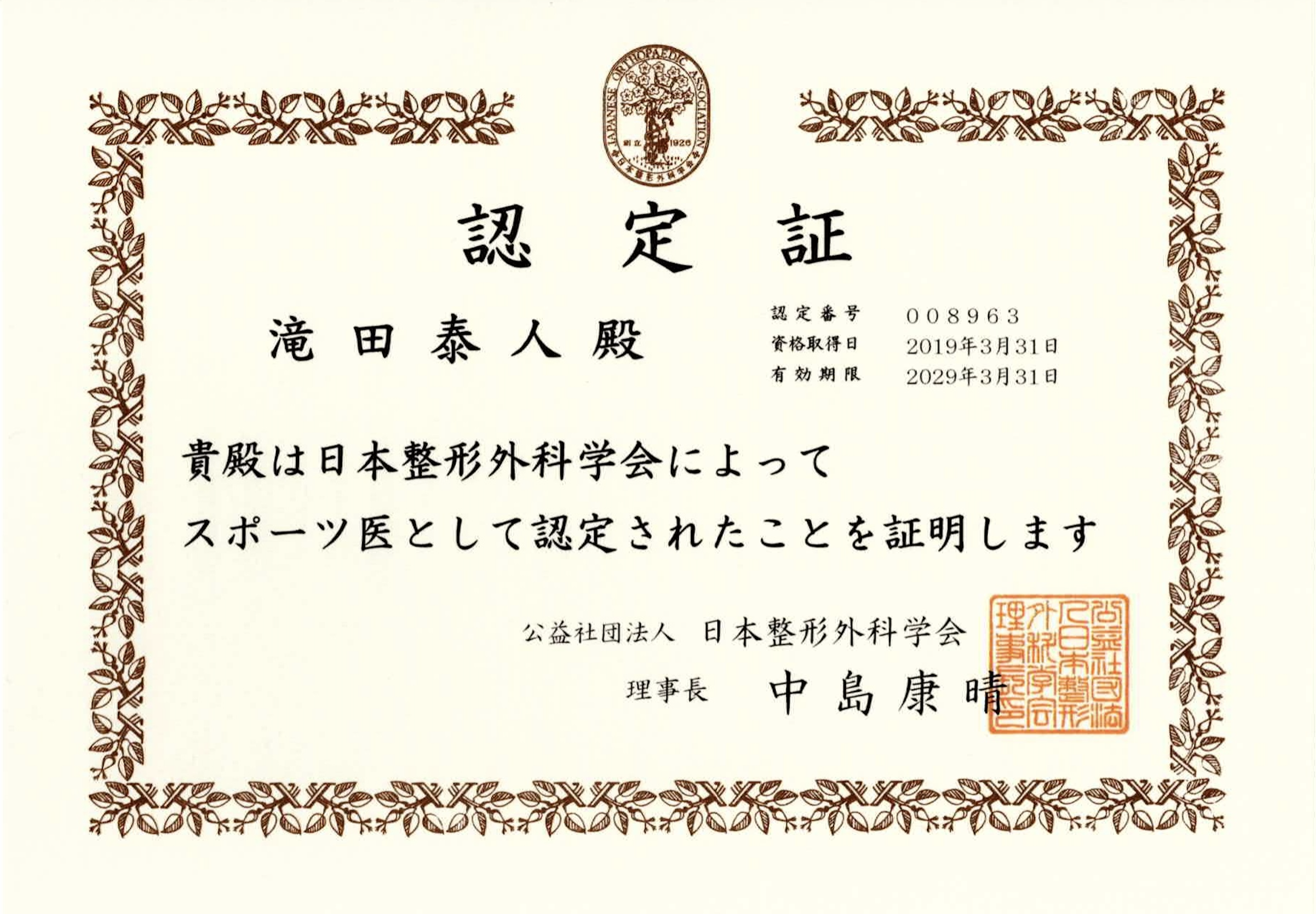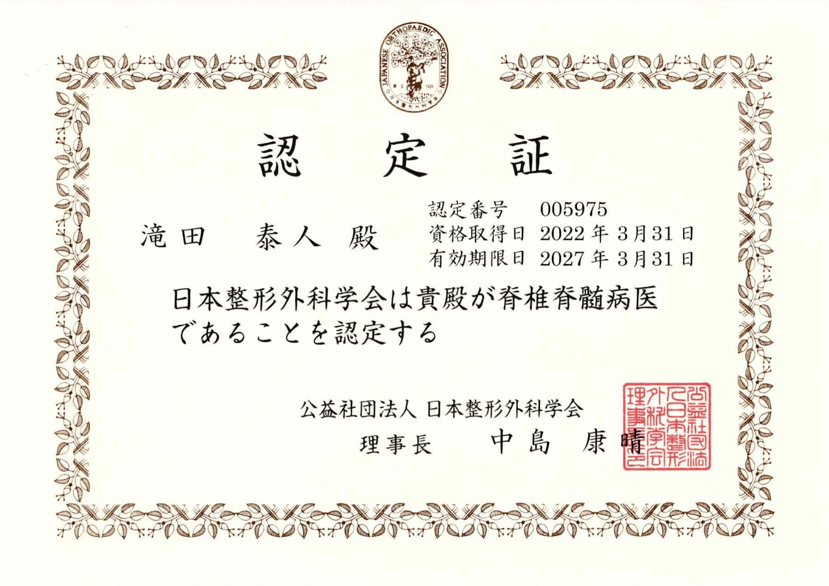 日本整形外科学会 認定脊椎脊髄病医 認定証